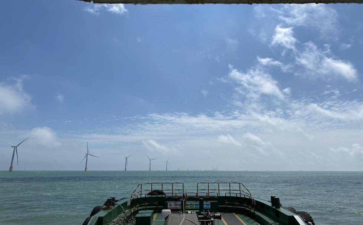 躲在船舱里不到二十分钟,风电场本次带队出海的“老法师”——杨清清就来喊我:“过了国电投的风电,就到我们H5风场啦!”内心稍有忐忑的我,还是抑制不住激动的心情,再次来到甲板上。果然,已经能看到我们的升压站了。