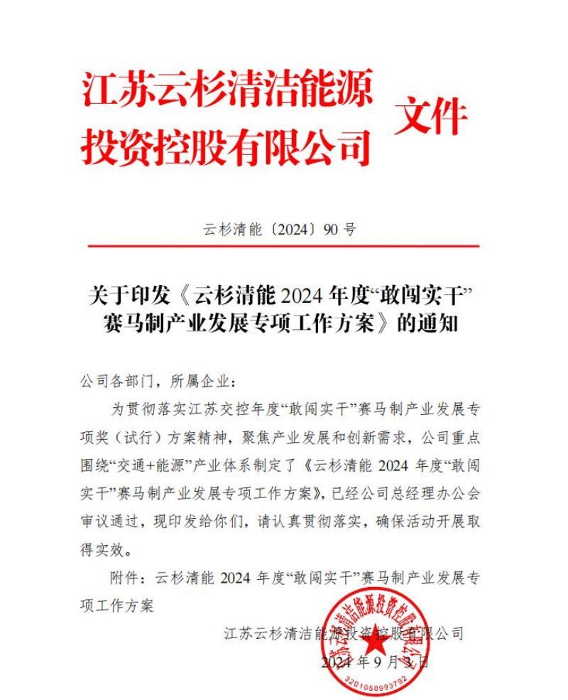 为深入实施创新发展战略,加快促进主业功能升级,全面贯彻落实江苏交控督办事项。近日,云杉清能组织召开江苏交控督查督办事项推进会并正式发布《云杉清能2024年度“敢闯实干”赛马制产业发展专项工作方案》,方案围绕“交通+能源”产业发展规划,启动首批七个“敢闯实干”赛马制项目,有效促进了人才、技术、成果等创新资源的有效融合,为加快形成新质生产力提供有力支撑。